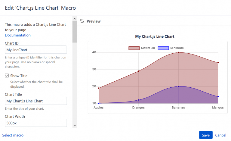 | **Chart Width**              | This value defines the width of the chart block. The chart itself will adjust to this size. You can enter a pixel (e.g. “500px”) or a percentage (e.g. “100%”) value. A pixel value will make the block exactly that size, a percentage value refers to the parent block, e.g. a Confluence page section. The default is “500px”. Enter the value without the quotes. |