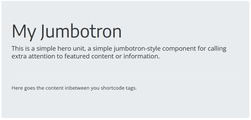 [bsv-jumbo heading="My Jumbotron" lead="This is a simple hero unit, a simple jumbotron-style component for calling extra attention to featured content or information."]Here goes the content inbetween you shortcode tags.[/bsv-jumbo]