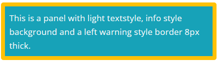 [bsv-panel textstyle="light" bgstyle="info" bordertop="no" borderright="no" borderbottom="no" borderleft="yes" borderstyle="warning" borderradius="rounded" styles="padding:8px;border-width:8px !important;width:400px;"]This is a panel with light textstyle, info style background and a left warning style border 8px thick.[/bsv-panel]