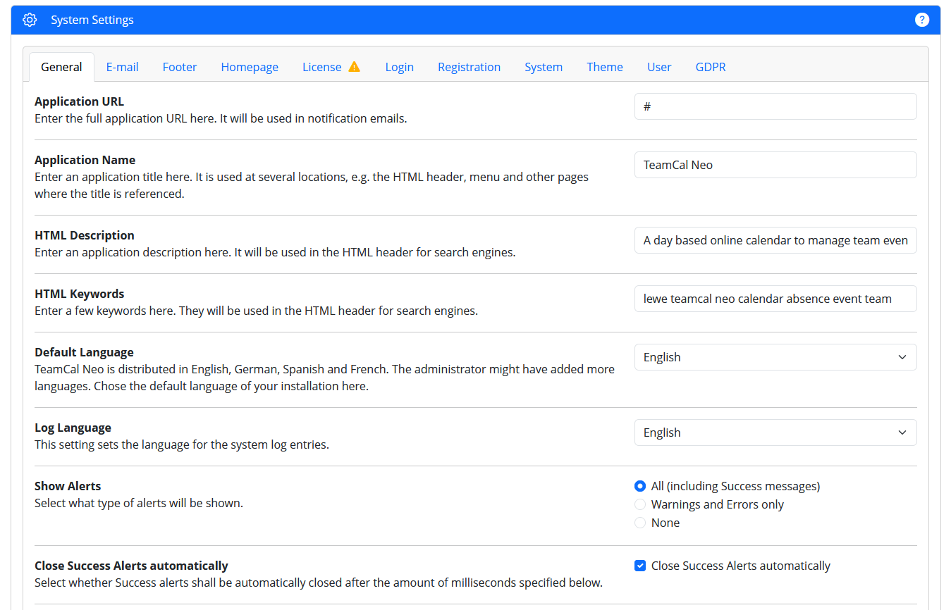 The System Settings page (previously known as "Framework Configuration") is organized in tabs. Each tab addresses a certain area and contains several settings you can configure. The labels and descriptions of each setting are on the page itself and should be sufficient for you to understand what each setting does.