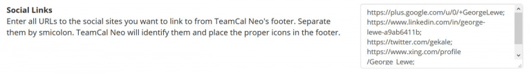 TeamCal Neo handles links to social networks intelligently. All you need to provide is one or more links to the desired pages, separated by a semicolon. TeamCal Neo will identify them and place the corresponding icons in the footer. Cool, isn’t it?