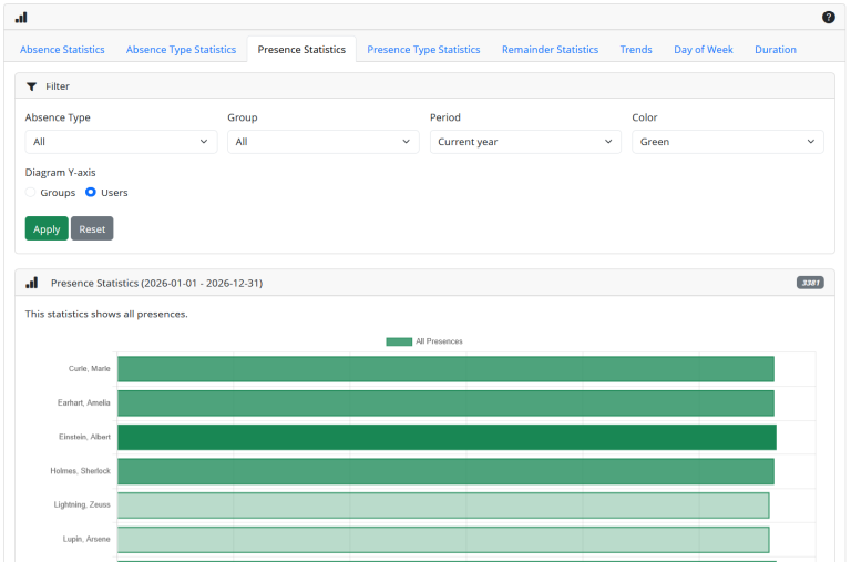 The Presence Statistics page displays all presences. You can select filters ate the top.